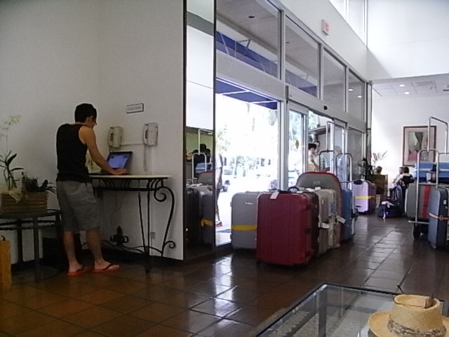 オハナワイキキマリアホテルは1Fロビーでしか無料で繋がらないのでやる気失せる。 写真はいとこが巨人戦の確認してるとこ。