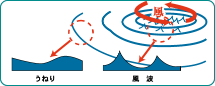 その風波が波紋上に広がってゆくのを「うねり」といいます。