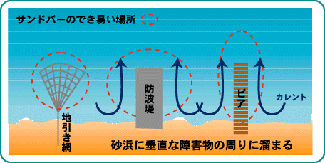います。例えば防波堤の周りやピアの周り、地引き網の網周辺にも砂は堆積します。
