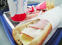ジャック・イン・ザ・ボックス 写真はターキー&ハムなんとか・・。すげー旨い。 マクドナルドとジャックがあるんだけど俺達はどっちかってーとジャック派。日本人が少なくて雰囲気がアメリカなのと安い。 ←どこ行ってもコーラデカイ。日本のMサイズが向こうのS感覚。 |