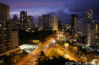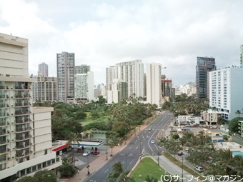 | 今回の宿はワイキキゲートウェイホテル。シングル料金が設定されてて安いうえにネット回線が部屋にあるというのでここに決めましたがオチがありました。 | ラナイから見た景色。ちょ~っと車の騒音がうるさいんだけど、1泊$70くらいだから文句は言えないかな~なんて思ってたら~ |